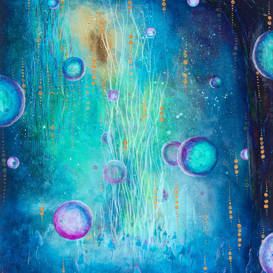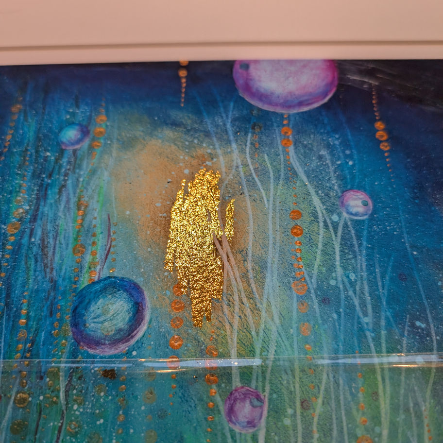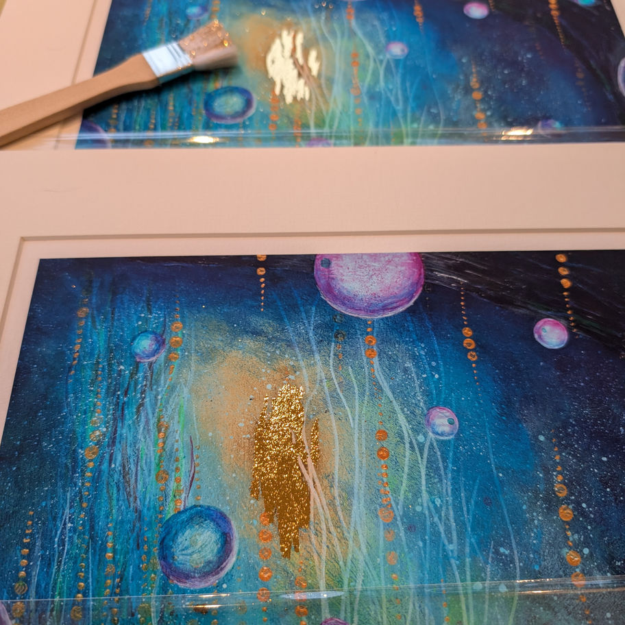 Indulge in the enchantment of Claire Lindsay's "Gaia's Gathering" hand embellished print, a masterpiece that captures an ethereal bioluminescent forest fungi scene. This giclée art print is hand embellished with gold coloured metallic leaf and further enhanced with gold textured paint, creating a luminous and dynamic effect. With a limited edition of 50 prints, each piece is printed on archival quality paper, ensuring its lasting beauty and value. Elevate your collection with this uniquely crafted artwork that celebrates the magic of nature.